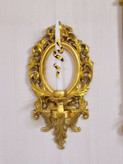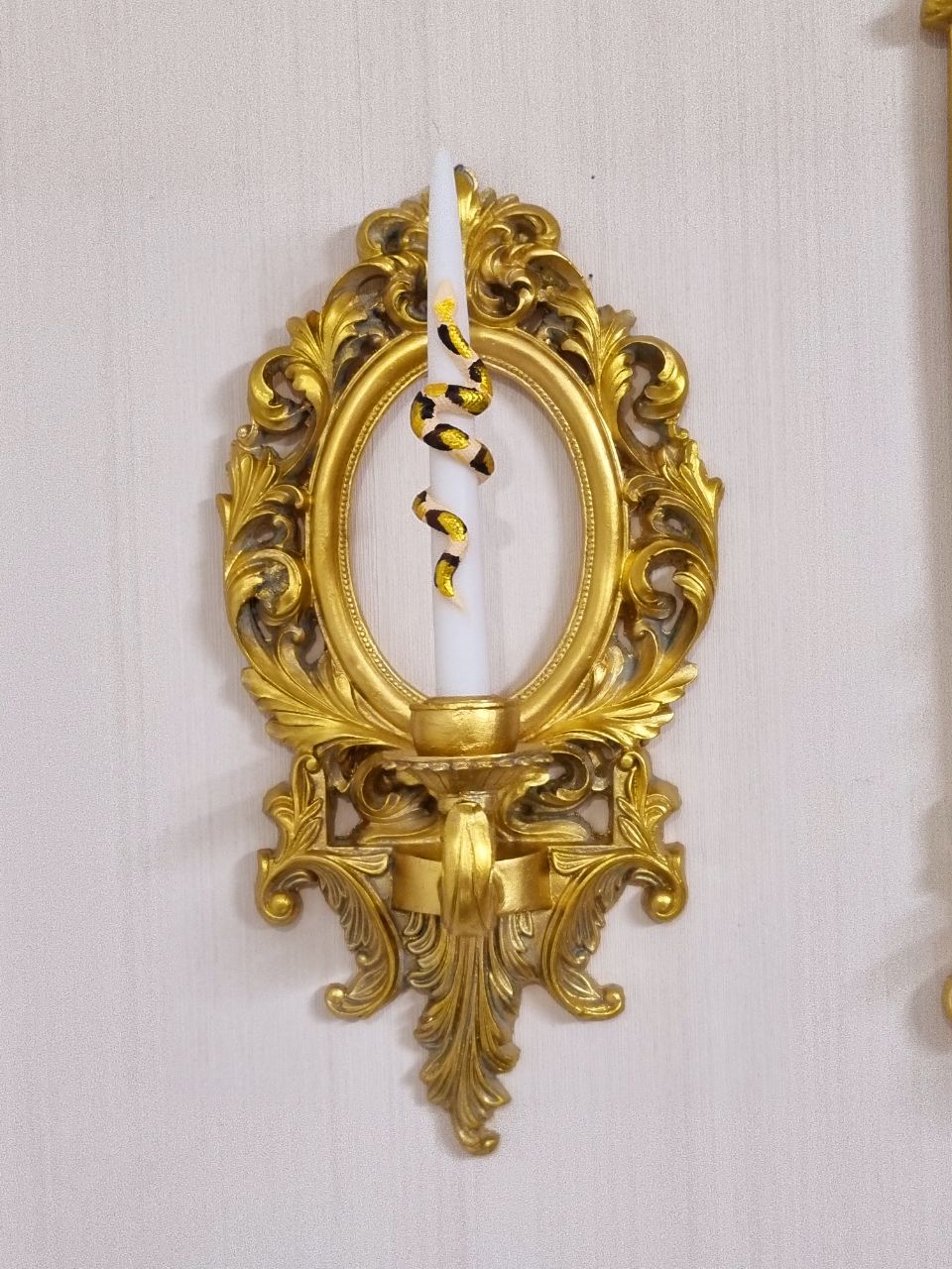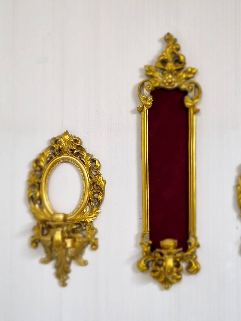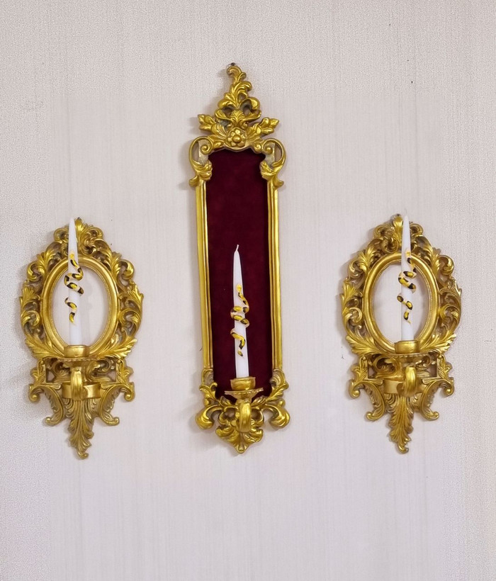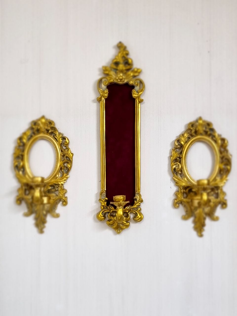 تصویر سه عدد شمعدان دیواری طلایی پرکار را نشان میدهد در مرکز، یک شمعدان مستطیلی بلند با روکش مخمل زرشکی عمیق و قاب طلایی پر زرق و برق قرار دارد. در دو طرف این قطعه مرکزی، دو شمعدان کوچکتر بیضی شکل قرار دارند. این شمعدانها نیز دارای قاب طلایی پر زرق و برق و یک جا شمعی در پایین با طراحی باز و تزئینی هستند. هر سه قطعه به سبک کلاسیک و باروک هستند.