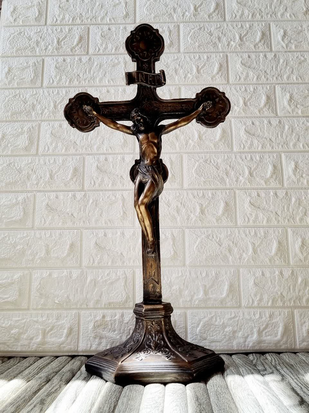 مجسمه رومیزی صلیب با سبکی کهنه وقدیمی برنز ارتفاع ۵۷ سانت