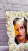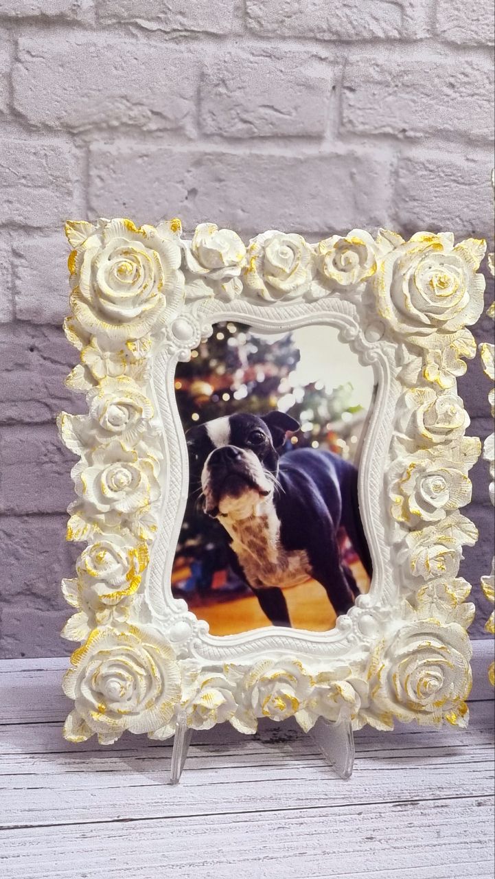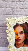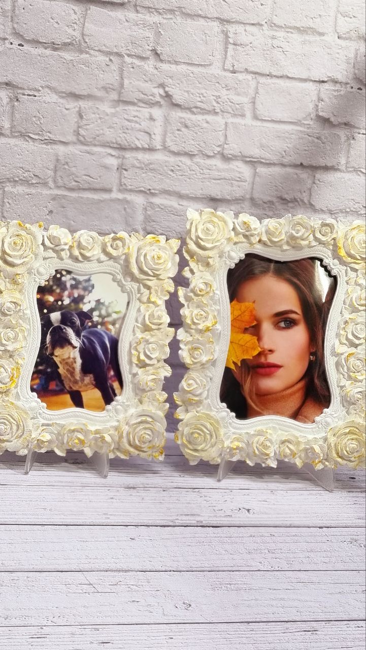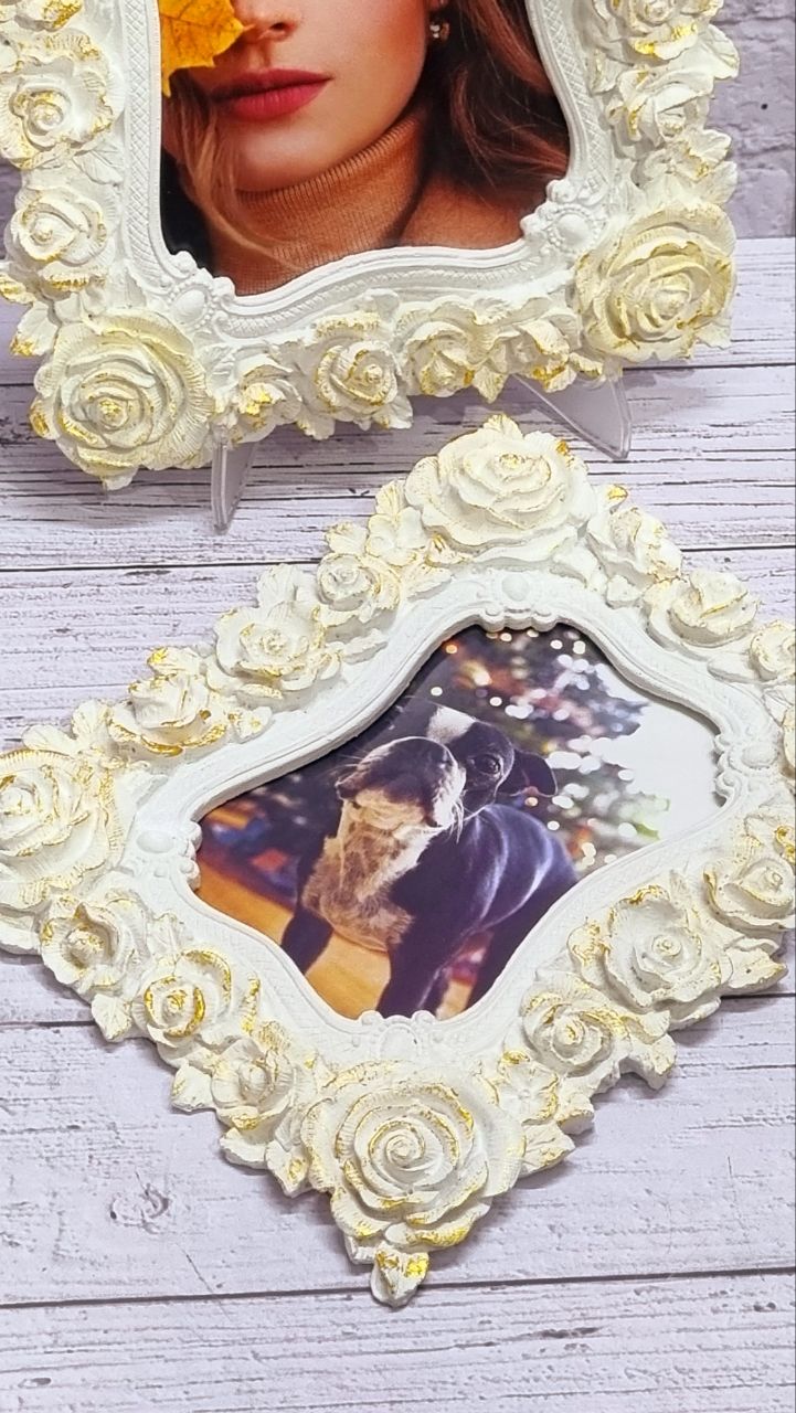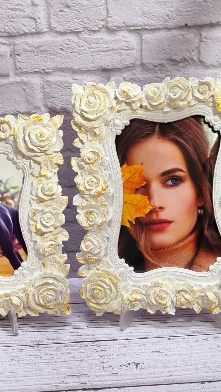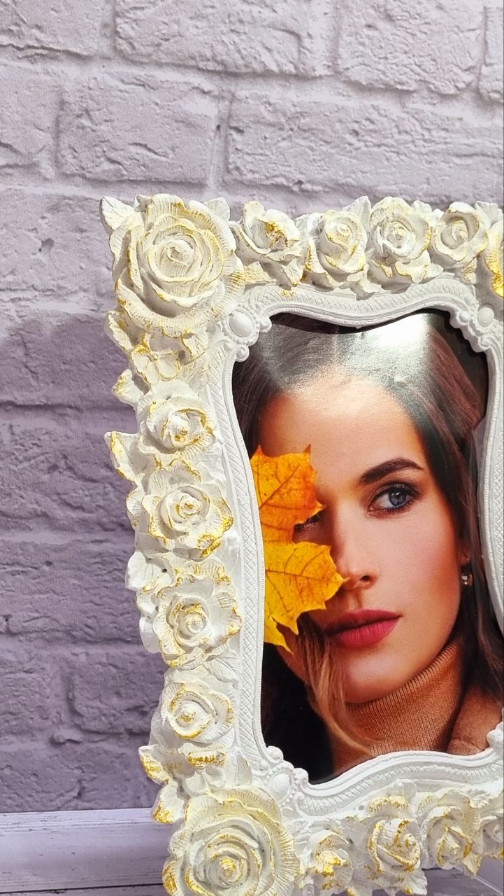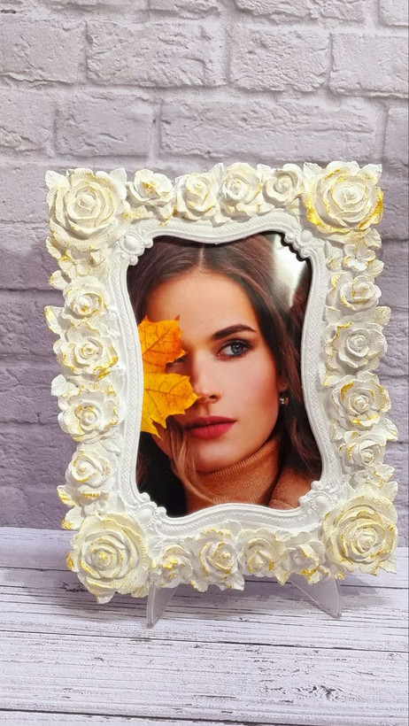قاب عکس رنگ قاب سفید طلایی با سایه های روی ان انجام شده که جلوههای لوکس و شیک به آن داده میشود.